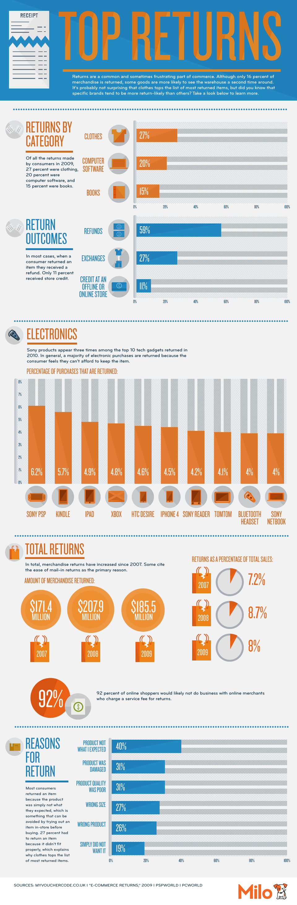 According to the infographic below, 16 percent of all merchandise items are returned, with the primary outcome being a refund. What was also striking is that the top answer consumers cite for any type of return is that the item was not what they expected, be it a device or a garment. The number of returns are steadily climbing and while it is a small economic indicator, it is a way to gauge consumer sentiment and behavior.