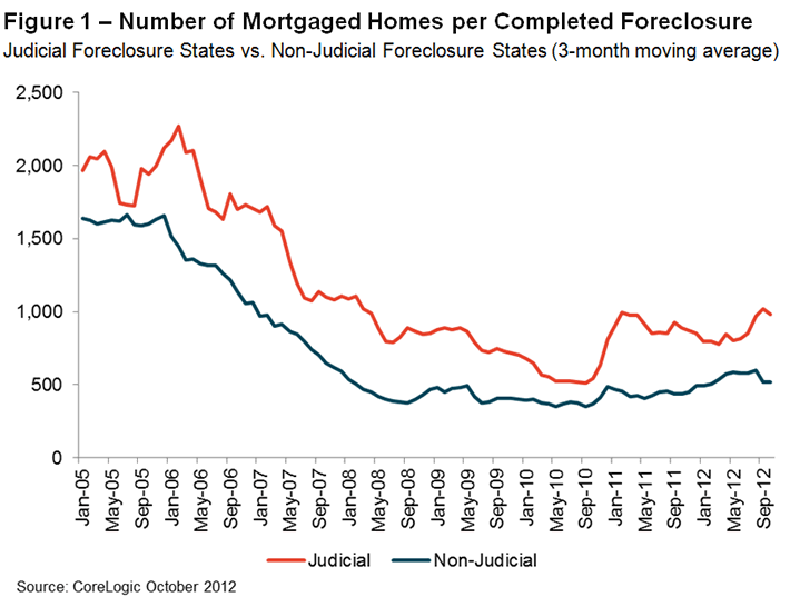 According to CoreLogic, there were 58,000 completed foreclosures in the U.S. in October 2012, down from 70,000 in October 2011 representing a year-over-year decrease of 17 percent. On a month-over-month basis, completed foreclosures fell from 77,000 in September 2012 to the current 58,000, representing a decrease of 25 percent. In this month’s report, CoreLogic revised September’s foreclosure levels from 57,000 completed foreclosures to 77,000.
