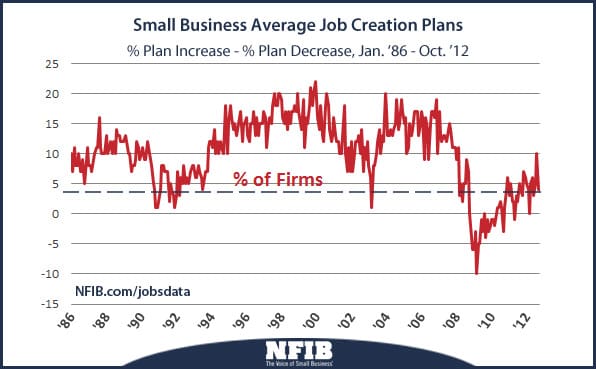 “While four of ten survey components rose, the Index still remains in solidly pessimistic—and recessionary territory,” said NFIB chief economist, William Dunkelberg. “In the 40 months since the alleged ‘recovery’ started in July 2009, the Index has never exceeded a reading of 95; the pre-recession average for the Index is 100. The election is over and Washington looks much like it did on November 5th. The fear of stalemate among the small-business community is palpable, as the looming fiscal cliff and the threat of higher costs and more taxes are very real possibilities come January. Until then, not knowing the direction of the economy will always have a dampening impact on spending and hiring.”