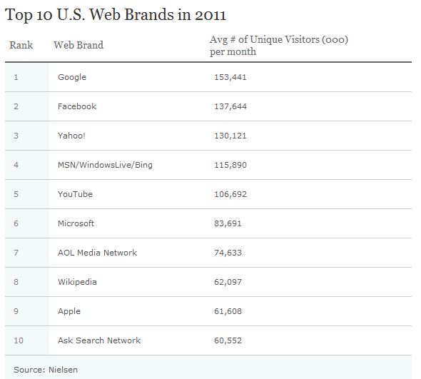 Below is the full list of the top 10 web brands for the year, according to Nielsen. It is our prediction that 2012 will feature many of these names, but the order will not look the same next year but will see some rise, others fall, yet Google will most likely remain on top.