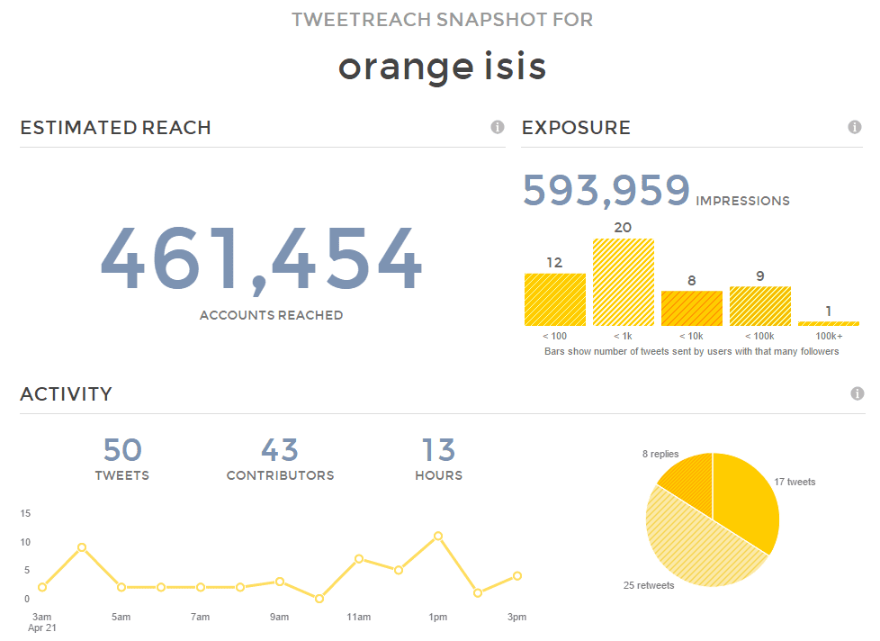 We noticed, however, that many people don’t know the hashtag, so a more broad search using terms “orange” and “ISIS,” both referring to the wearing of orange, were more voluminous: