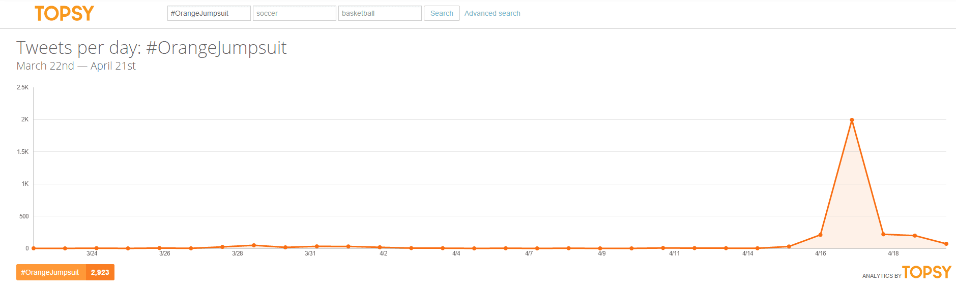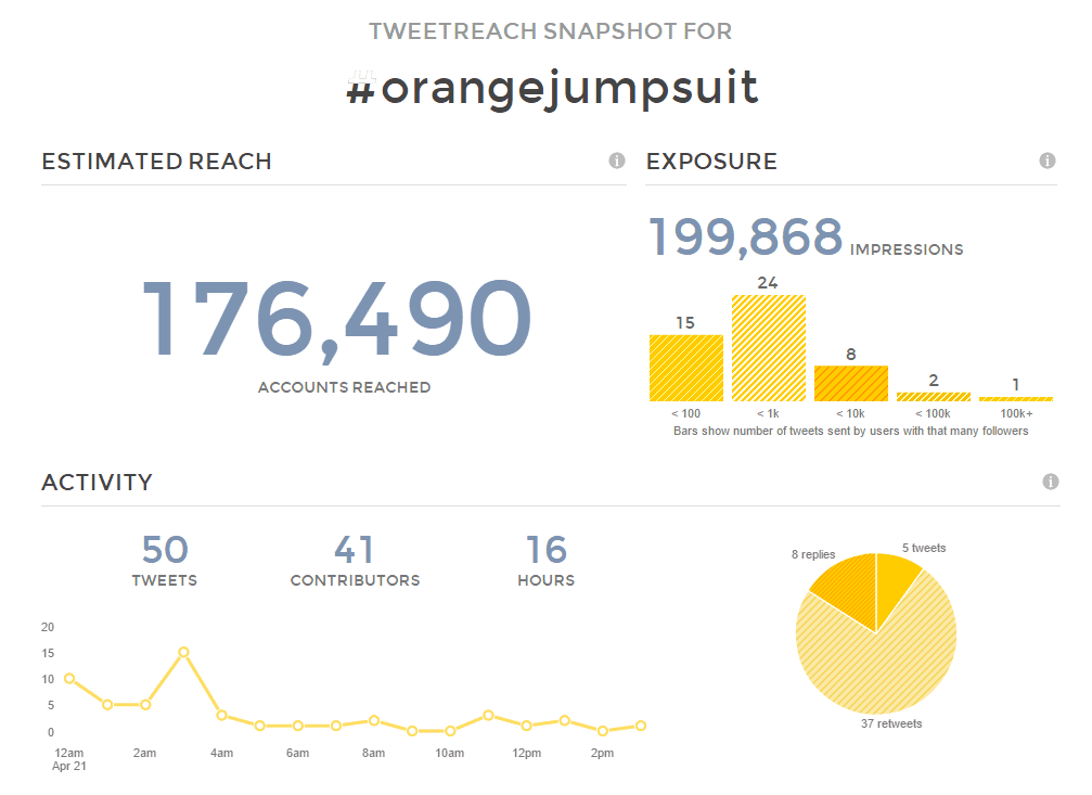 Further, a sampling of data from TweetReach reveals that the #OrangeJumpsuit hashtag has nearly 200K impressions on Twitter alone: