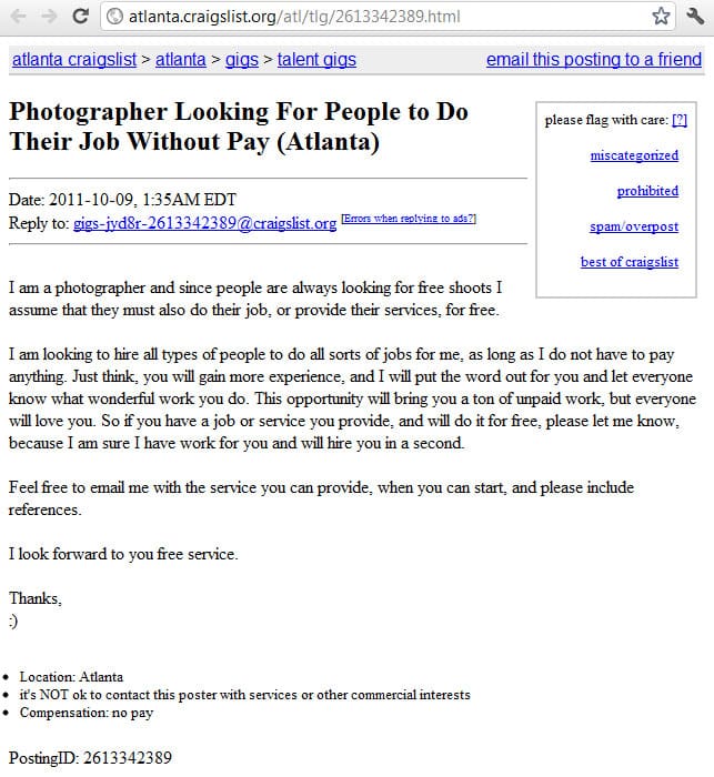 Anyone in any consulting or freelance role gets asked all the time, “can we meet for coffee so I can pick your brain?” and the world often expects that your time (and labor and skill) is free because you aren’t a corporation. The above is a real ad from Craigslist in Atlanta from a photographer who is obviously tired of being asked for free photography, a common plight in this and other industries.