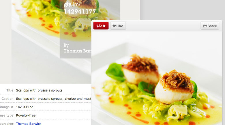 Pinterest explains, “For example, you may stumble across a pin of a delicious dish that strikes you as something you might like to make someday. Unfortunately, if the original pinner uploaded the image and skimped on the description or if the link is broken, we probably couldn’t tell you that it’s scallops with brussels sprouts, chorizo and mustard fondue. Also, if you searched for “scallops with brussels sprouts,” we wouldn’t know that this great image by Getty Images contributor Thomas Barwick is a match. With Getty Images’ help, we hope to be able to make this image more useful and suggest another recipe with scallops and brussels sprouts or healthy scallop recipes.”