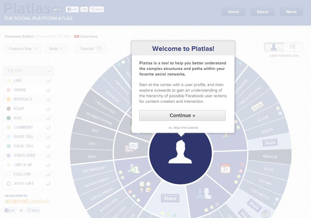 Platlas drills down from broad Facebook user behaviors down to the very specific actions taken by a user who is depicted in the center of the circle as the Facebook face icon. Each icon represents a specific area or action on Facebook ranging from apps to photos and events with the outer ring showing the various areas actions a user can take, complete with an explanation.