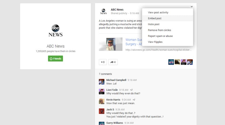 In the embedded Google+ post, site visitors can +1 a post, comment on it, add the post’s author to their circles, and even report the post as abusive if it violates Google’s rules. This interactivity is important not only because embedding your own posts on your own blog can help expand your social network, but to please the Google Gods.
