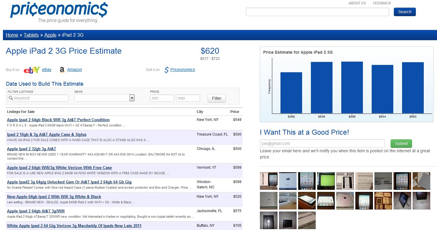 Priceonomics launched in December of 2011 after a seed round of funding through Y-Combinator, and this Mountain View, California based company has a chance to use modern web culture to undercut the Kelly Blue Book legacy empire by crowdsourcing and combing the web for the current values of products, taking out the element of surprise and hours of research to determine the street values of products from televisions to iPads to boats and even strollers.