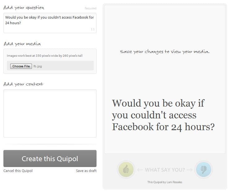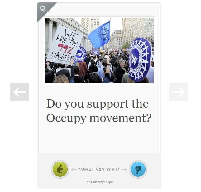 Quipol calls itself a social polling tool and says, “It’s a simple and elegant way to unlock the opinions and perspectives of your online audience. Quipol makes it easy to create social polls, share them with your audience, and monitor the results.”