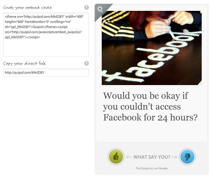 The service is fabulous for bloggers as one question can be your entire blog post, and great for Facebook pages as it generates an embed code as well as a link to accommodate whichever use you deem most appropriate, rather than being limited or dictated to as various other polling options.