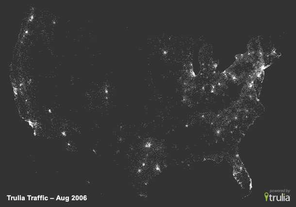Below, each white dot represents a zip code where a house for sale was viewed by a web visitor on Trulia, with large cities having higher volumes of search which Trulia says “makes sense since there are a lot more homes to buy in bigger metro areas” and we would add that it is expected as the populations are more dense.