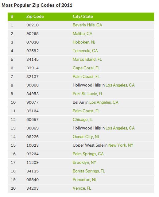 The company outlines the most popular zip codes, noting that 90210 is the most popular zip code, possibly because “a lot of fans looking at LA for their next move who couldn’t resist checking out what Beverly Hills has to offer,” as it was made popular by Aaron Spelling’s continuing television teen drama. Florida’s east and west coasts were more popular than the north or south of the state while the only city in the Midwest to make the top 20 was Chicago.