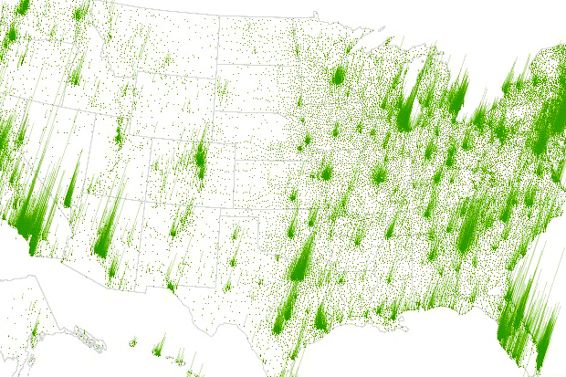 Additionally, Trulia says that “rather than just illustrating each property view as a single dot that gets lit up when a home gets checked out in a zip code, we’re adding another layer of detail – popularity,” with each green spike below representing a zip code where a house for sale was viewed with the tallest spikes being the most popular. The spikes can be changed by moving the slider to view different points in time and how areas of popularity changed as the site grew (click the image below to launch the interactive graphic):
