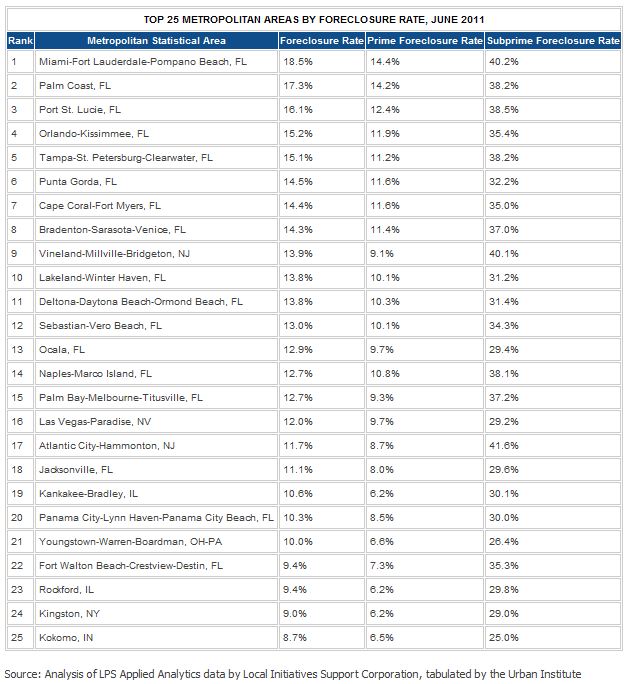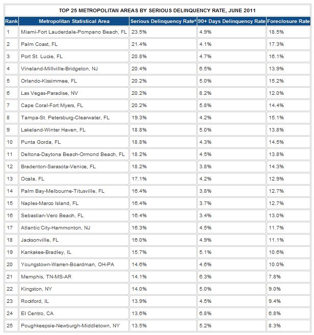 According to Foreclosure-Response.org, the serious mortgage delinquency rate in the 100 largest metropolitan areas experienced a slow decline from 10.4 percent at its peak in December 2009, down to 9.3 percent in June 2011, the most recent month of full data.