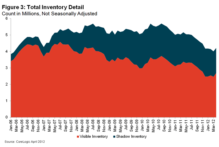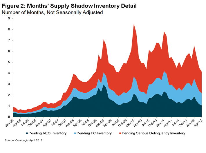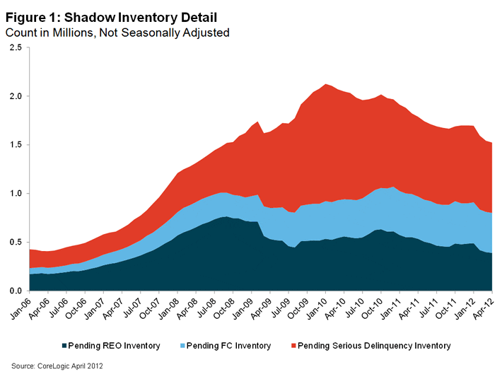 According to CoreLogic, the residential shadow inventory fell 14.8 percent between April 2011 and April 2012, hitting 1.5 million units, representing a four month supply, down from last year’s 1.8 million units, or a six months’ supply, approximately the same level as October 2008. The 1.5 million units represents just over half of the 2.8 million properties currently seriously delinquent, in foreclosure or REO. The four-month supply of shadow inventory is at its lowest level in nearly three years