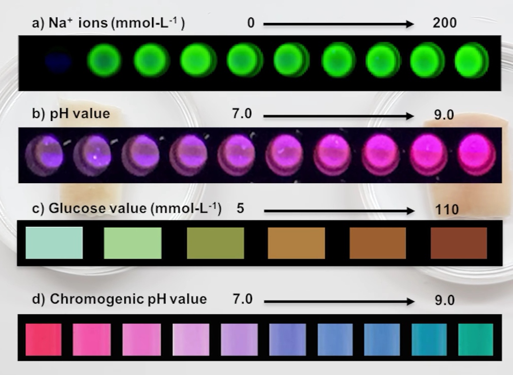 So far, the inks that have been developed are green to brown, such as in the case glucose concentration increases. There is also a green ink, visible while under a blue light, which grows much more intense when sodium concentration rises, an indication of dehydration.