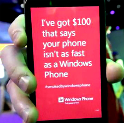 If an attendee could perform an agreed upon task faster than Rudolph on a Windows Phone, they were handed a fresh $100 bill, but if they lost, they had to look into the camera and profess that they were “smoked by Windows Phone,” which viewing several videos appeared to be quite difficult for losers to do.