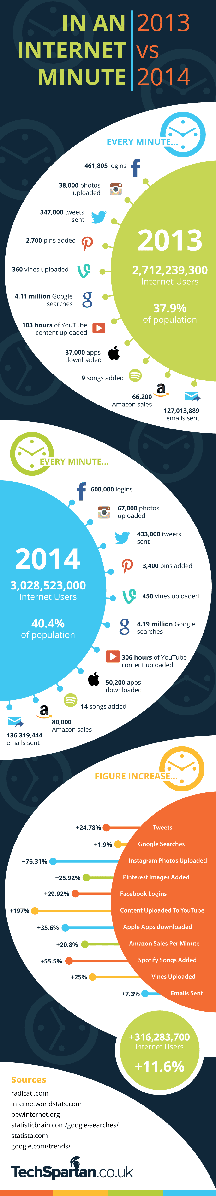 TechSpartan.co.uk complied an infographic (below) to look at the increase of Internet and social media usage between 2013 and 2014. And, as you may have guessed, every portion they reviewed had increased.