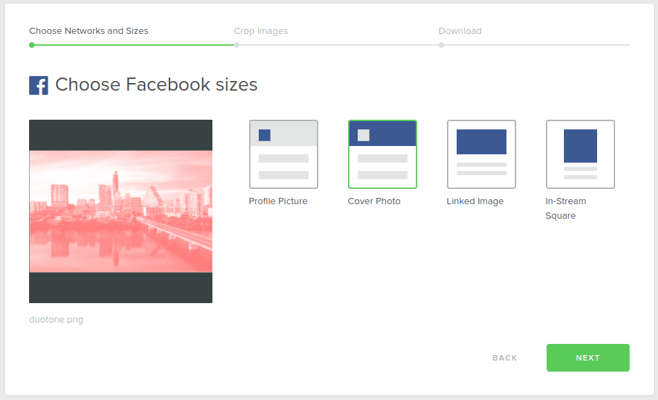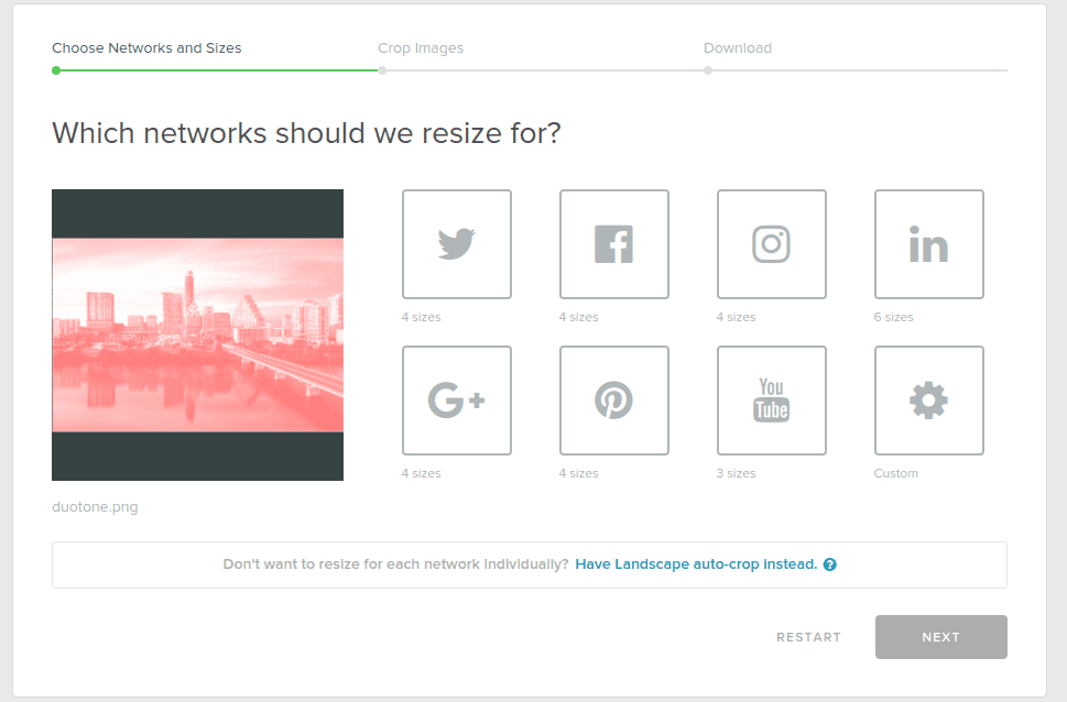 The free app was created by Sprout Social and it’s easy to use. First, you select an image and upload it to Landscape. Then, you choose the social networks that you want the image to be sized for. Finally, you crop the images to their respective sizes and upload them to your pages.