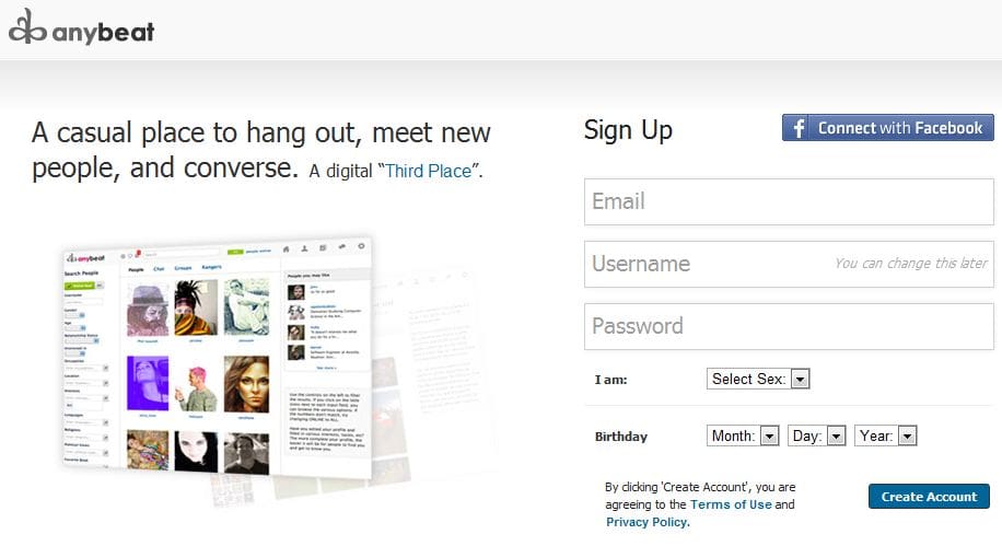 AnyBeat.com is a social network that takes technology and design of 2011 and mixes it with the free spirit anonymity of 2001 and serves it up as a conversation platform with interests to converse or video chat about from business and marketing to sex or spirituality with the goal of having a place to talk without your professional connections or parents seeing your personal thoughts. The network is so serious about keeping this culture that they ask users not to use the site to build their personal brand as they would on Google+.