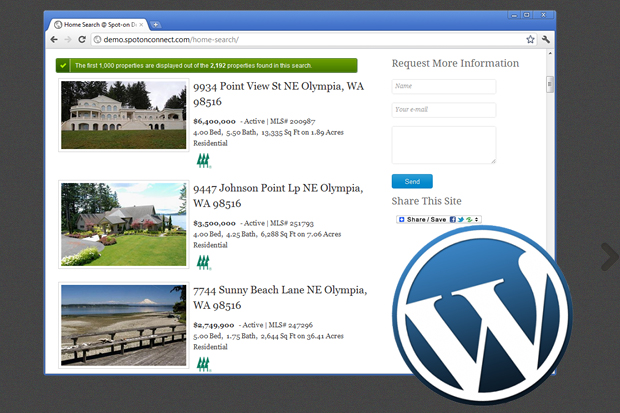 Spot-on Connect is an easy to install WordPress IDX plugin that gives real estate websites full MLS search, and they claim it takes less than a minute to activate (see the video above). The service is $29 per month and requires no contract or setup fee.