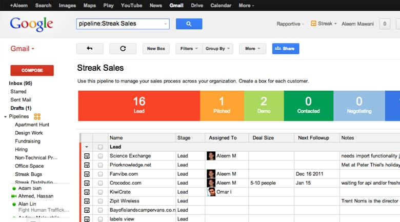 Before you can begin using Streak, you must first add it to your favorite, most-used browser. Then, simply login to your account. Finally, go to your Gmail account and have at it. One of the coolest features is that you can track customer sales, at all stages of the sale. But you can do more than that. You and your team can choose to include customer correspondence for everyone to see.
