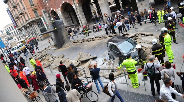 Recently, on the streets of Milan, locals and tourists were startled awake by the sights and sounds of a submarine crash in the middle of a busy street, prompting dozens of social media updates immediately from people trying to figure out what happened as what appeared to be sailors popped out of the top, and emergency workers sealed off the scene as paramedics took survivors away on stretchers.