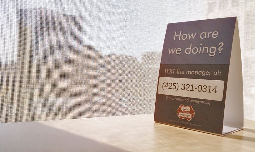 First, by signing up for the service, businesses are instantly provided with a dedicated phone number to display at their business. After displaying the number, customers are encouraged to text their comments completely anonymously.