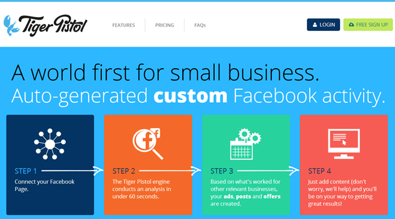 Setup is easy: connect your Facebook page, Tiger Pistol will conduct an analysis in under sixty seconds, based on what’s worked for similar businesses your ads, posts, and offers are created, then just add your content and you are finished.