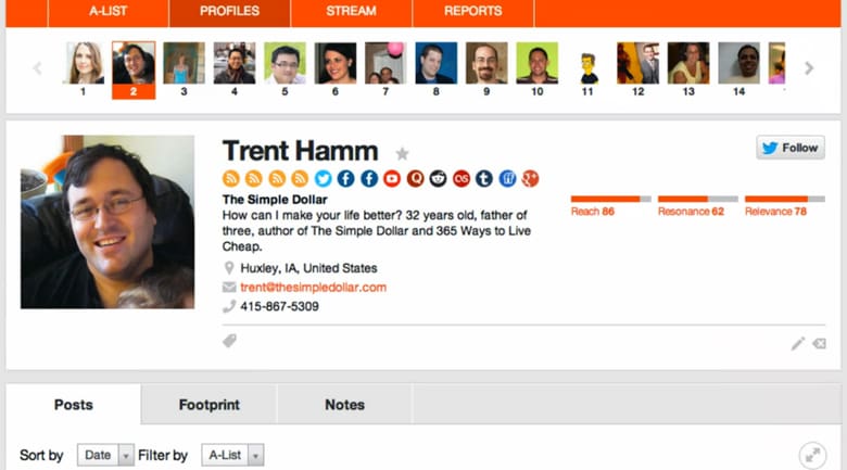 With Traackr you also have access to full online profiles via online footprints providing full contact information and social profiles to show you every place they publish relevant content. Influencer network maps also let you identify influence hubs, find ways to build new ones, and see how your content will likely travel.