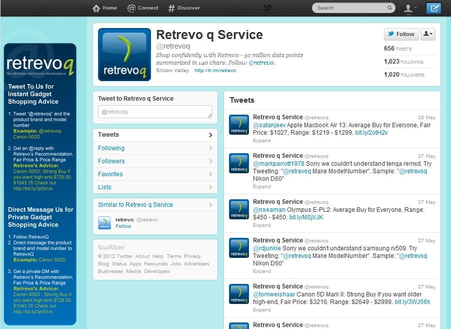 Just send a tweet to @RetrevoQ indicating the brand name and model number and they’ll respond with a recommended price range and a fair price, so you can identify if you’re actually getting a good deal or if you need to take your business elsewhere. You also have the option to send a direct message to Retrevo with the same information and get a private DM back. Alternatively, you can visit the Retrevo website with more detailed information as depicted above.