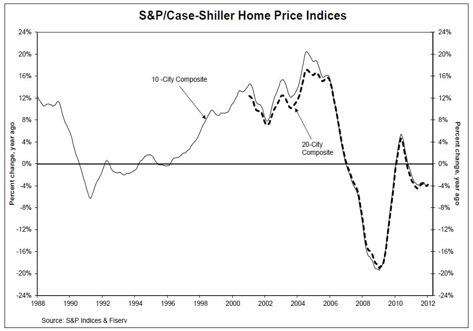 In January, the average home lost 0.8 percent of its value from December and 3.8 percent from January 2011. Although this HPI report only studies 20 major markets, it is widely recognized as a reliable housing indicator. The 10-City Composite was down 3.9 percent and the 20-City was down 3.8 percent compared to January 2011.