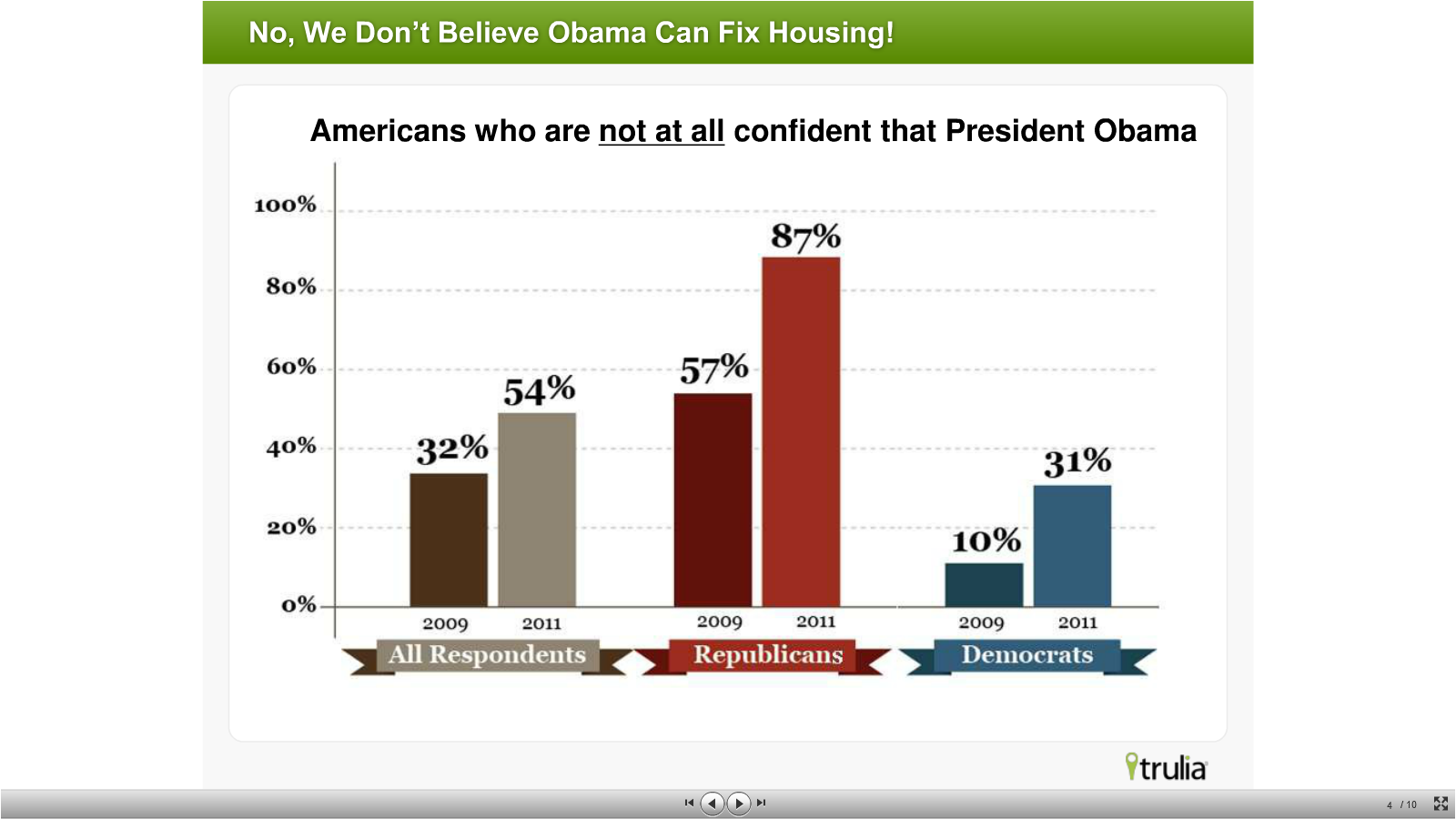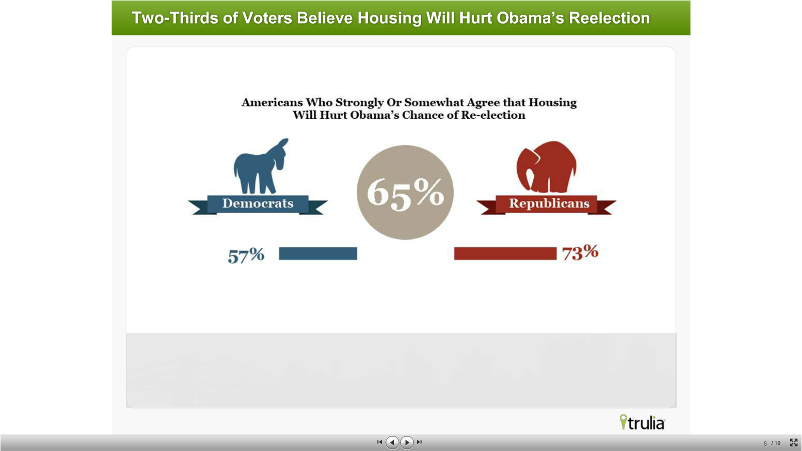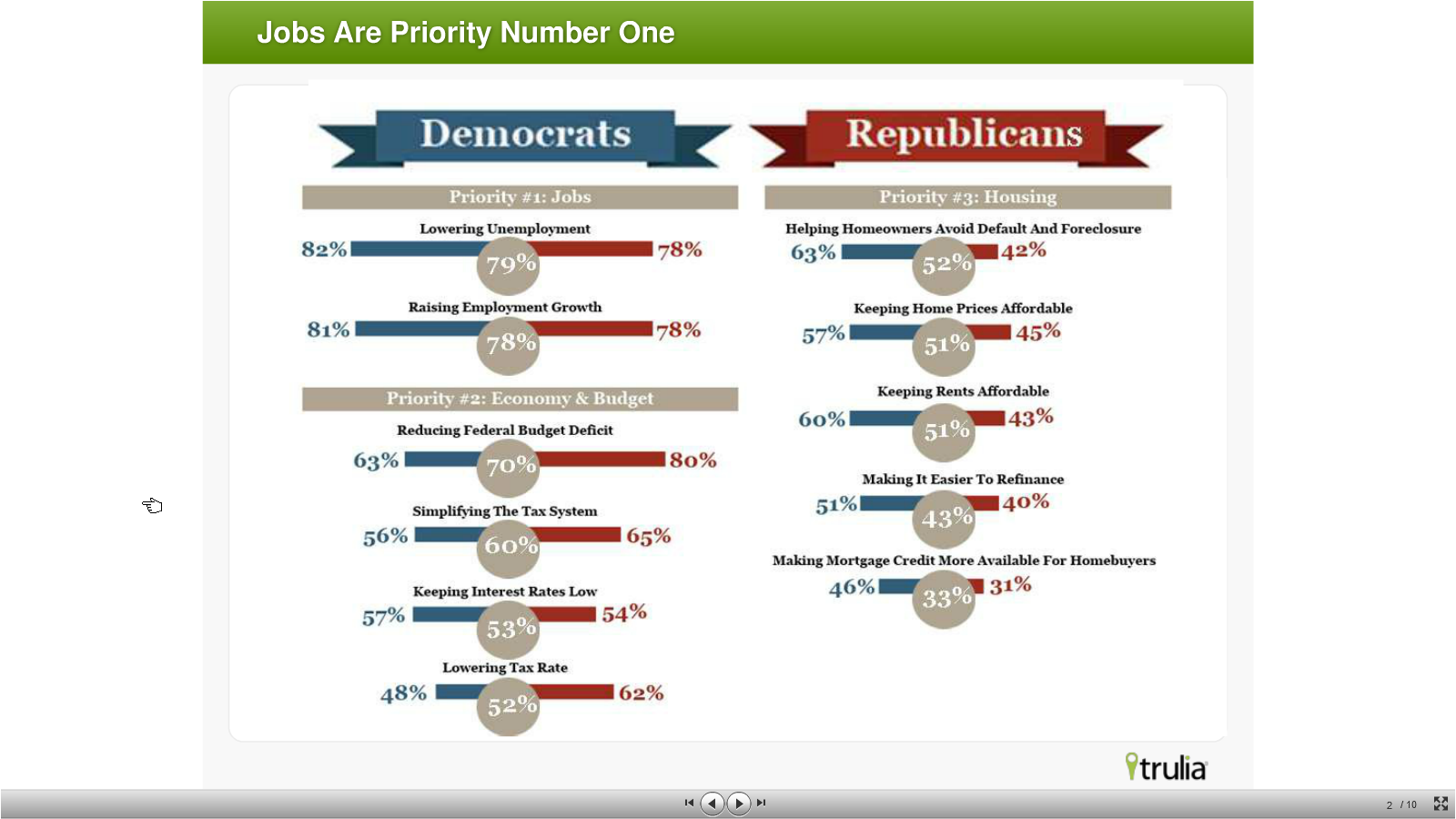 According to a new study just released by real estate media company, Trulia, Chief Economist, Dr. Jed Kolko predicts that consumer confidence will remain low and voters will be frustrated in the 2012 election cycle as they witness more talk than action leading up to November. Consumers currently believe jobs are the number one priority followed by the economy and housing.