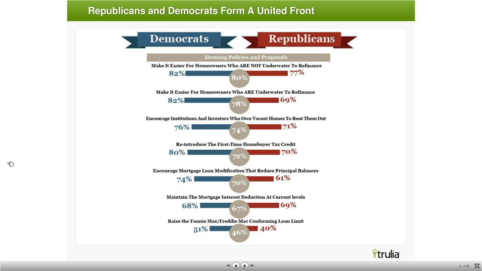 The unified sentiment among Republicans and Democrats is that the government is not the answer, and that the priority should be keeping current homeowners in their homes, not necessarily creating a new buyer pool or going back to the era of easy credit. Kolko said, “voters are not looking to roll back the clock to boon times.”