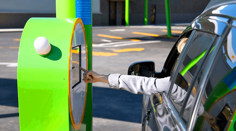 Customers wishing to use the Pick-Up Grocery place their order anywhere from three weeks to two hours in advance, and at an appointed time, they pull up in a drive-thru lane, and enter their last name and order on the touchscreen kiosk.