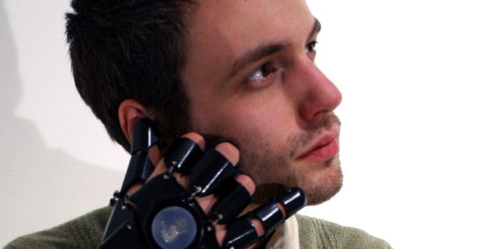 Cera says his glove is not meant to be used by everyone on the planet, rather makes a statement that the creation represents a future where smartphones have become an actual part of our bodies, and our hands become a vestigial limb replaced by a handset. It sounds very Star Trek-like, but Cera explains, “It presents a futile and fragile technology with which to augment ourselves. A cell phone which, in order to use, one must sacrifice their hand. It is both the literalization of Sherry Turkle’s notion of technology as a “phantom limb”, in how we augment ourselves through an ambivalent reliance on it, as well as a celebration of the freedom we seek in our devices.”