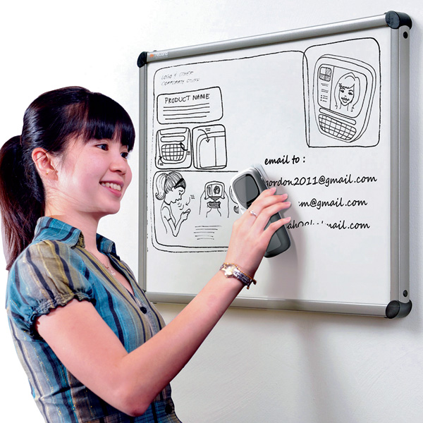 Rather than developing a whiteboard that remembers what you write on it, a more sensible tech concept has been released, called the “Erascan,” which is a simple whiteboard eraser that through a memory chip inside of the eraser, scans and remembers everything being erased from the board.