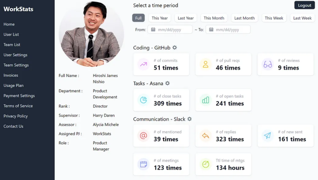 WorkStats describes itself as “a dashboard tool to quantify your productivity by visualizing numbers from services such as GitHub, Jira, Asana, Google, and Slack.”