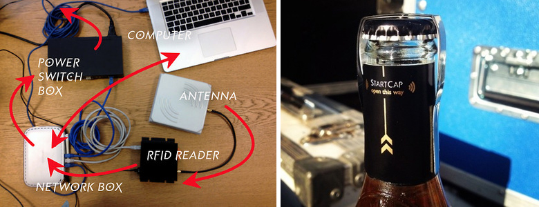 Used to tag and track everything from Wal-Mart shipments, to American Passports, or even high value poker chips at Wynn casinos, RFID sends signals, and in the case of the StartCap, signals are sent to a reader that recognizes the tag, which activates a switch in a central computer. Strongbow demonstrates that by exposing the tag upon opening, party or event guests can be surprised by just about anything an organizer dreams of.