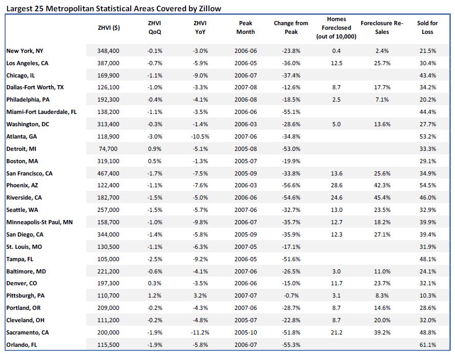 Quarterly declines were reported in 67 percent of metro areas tracked by zillow, with 26 of 157 markets posting an increase in values.
