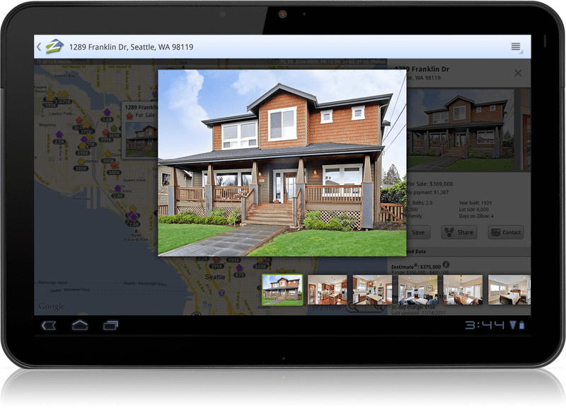 Zillow says their Android Tablet App is the only real estate app available for the Android Tablet that allows shoppers to compare homes side by side. Additionally, the app offers a large touch-screen map for searching rent or sale listings, full screen photos of homes with Google Street View integrated. Users can install a widget to browse nearby homes from the tablet home screen based on the Android Tablet’s current GPS location.