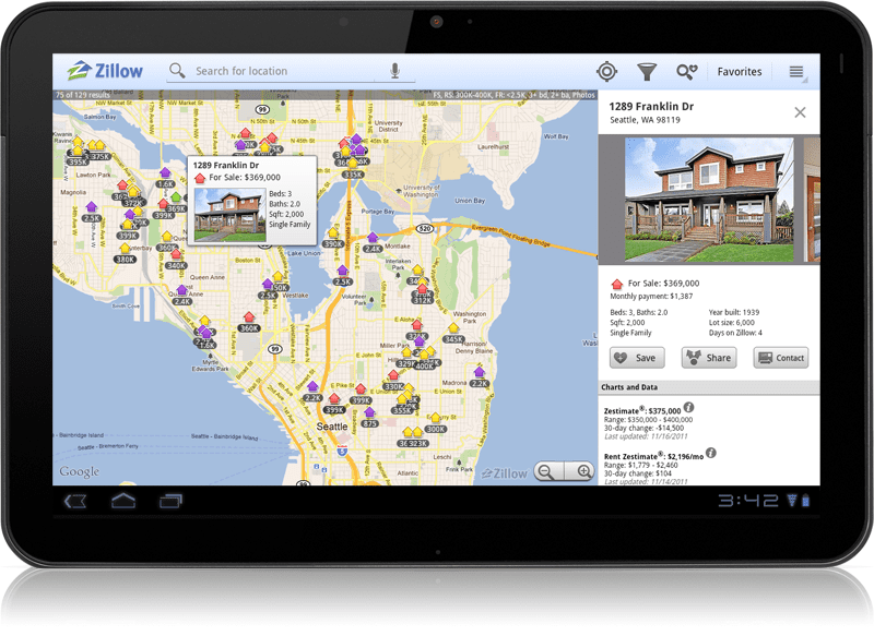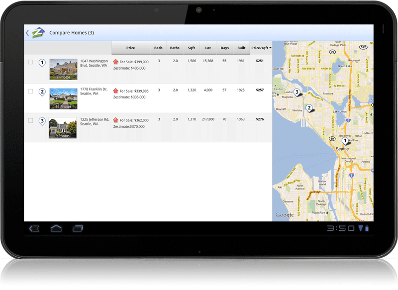 “With today’s announcement, we are proud to say that Zillow has the largest collection of mobile real estate apps,” said Spencer Rascoff, Zillow CEO. “Zillow continues to reinvent the mobile home shopping experience and the Zillow Android Tablet App is no exception. The app was designed just for the Android Tablet and brings two entirely new features to real estate shopping – side-by-side compare and a nearby-homes widget, giving home shoppers two new ways to shop for homes.”